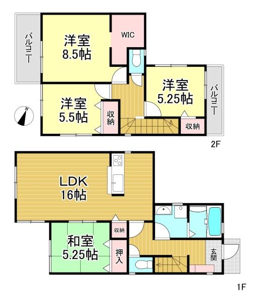 階数 区分 広さ 1F LDK 16.0帖 1F 和 5.3帖 2F 洋 8.5帖 2F 洋 5.5帖 2F 洋 5.3帖 - 駐車場
