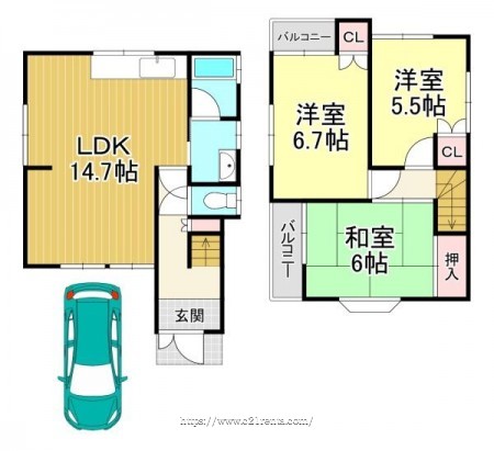 階数 区分 広さ 1F LDK 14.7帖 2F 洋 6.7帖 2F 洋 5.5帖 2F 和 6.0帖 - 駐車場