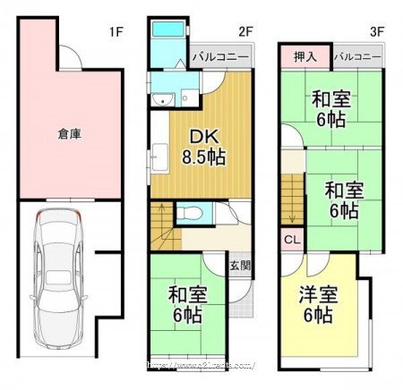 階数 区分 広さ 2F DK 8.5帖 2F 和 6.0帖 3F 和 6.0帖 3F 和 6.0帖 3F 洋 6.0帖 - 駐車場
