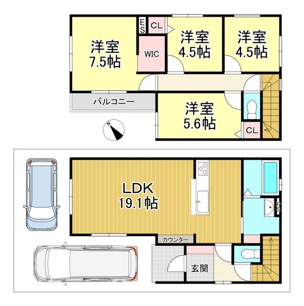 階数 区分 広さ 1F LDK 19.1帖 2F 洋 7.5帖 2F 洋 5.6帖 2F 洋 4.5帖 2F 洋 4.5帖 - 駐車場