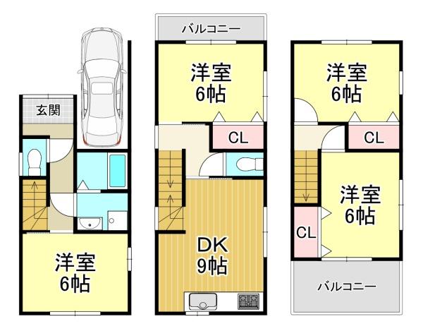 階数 区分 広さ 1F 洋 6.0帖 2F 洋 6.0帖 2F DK 9.0帖 3F 洋 6.0帖 3F 洋 6.0帖 - 駐車場