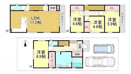 階数 区分 広さ 1F 洋 6.9帖 2F LDK 17.2帖 3F 洋 5.9帖 3F 洋 4.6帖 3F 洋 4.8帖 - 駐車場