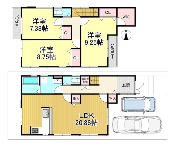階数 区分 広さ 1F LDK 20.9帖 2F 洋 9.3帖 2F 洋 8.8帖 2F 洋 7.4帖 - 駐車場