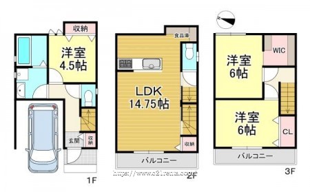 階数 区分 広さ 1F 洋 4.5帖 2F LDK 14.8帖 3F 洋 6.0帖 3F 洋 6.0帖 - 駐車場
