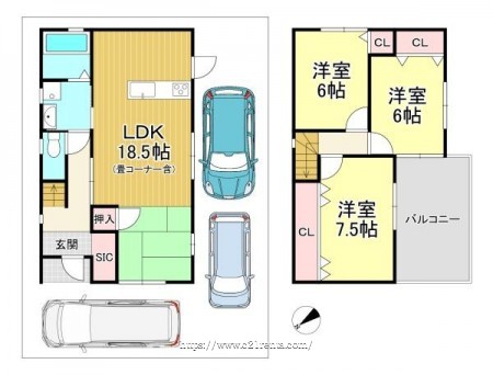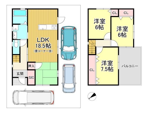 階数 区分 広さ 1F LDK 18.5帖 2F 洋 7.5帖 2F 洋 6.0帖 2F 洋 6.0帖 - 駐車場