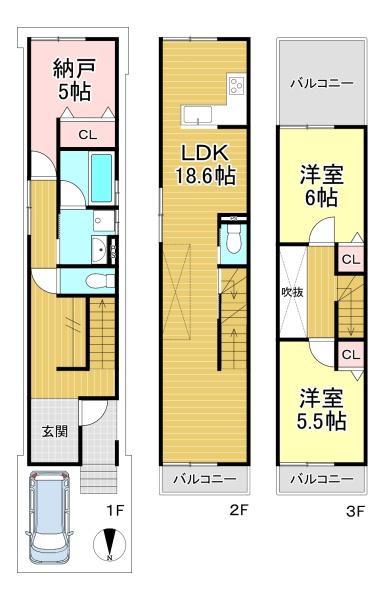 階数 区分 広さ 1F S 5.0帖 2F LDK 18.6帖 3F 洋 6.0帖 3F 洋 5.5帖 - 駐車場