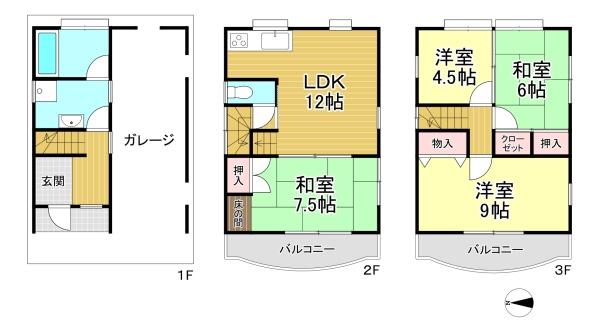 階数 区分 広さ 2F LDK 12.0帖 2F 和 7.5帖 3F 洋 4.5帖 3F 和 6.0帖 3F 洋 9.0帖 - 駐車場