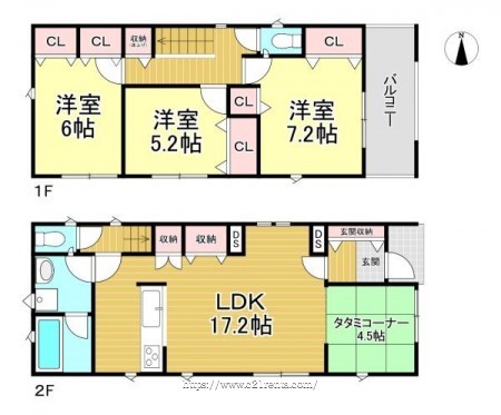 階数 区分 広さ 1F LDK 17.2帖 2F 洋 6.0帖 2F 洋 5.2帖 2F 洋 7.2帖 - 駐車場