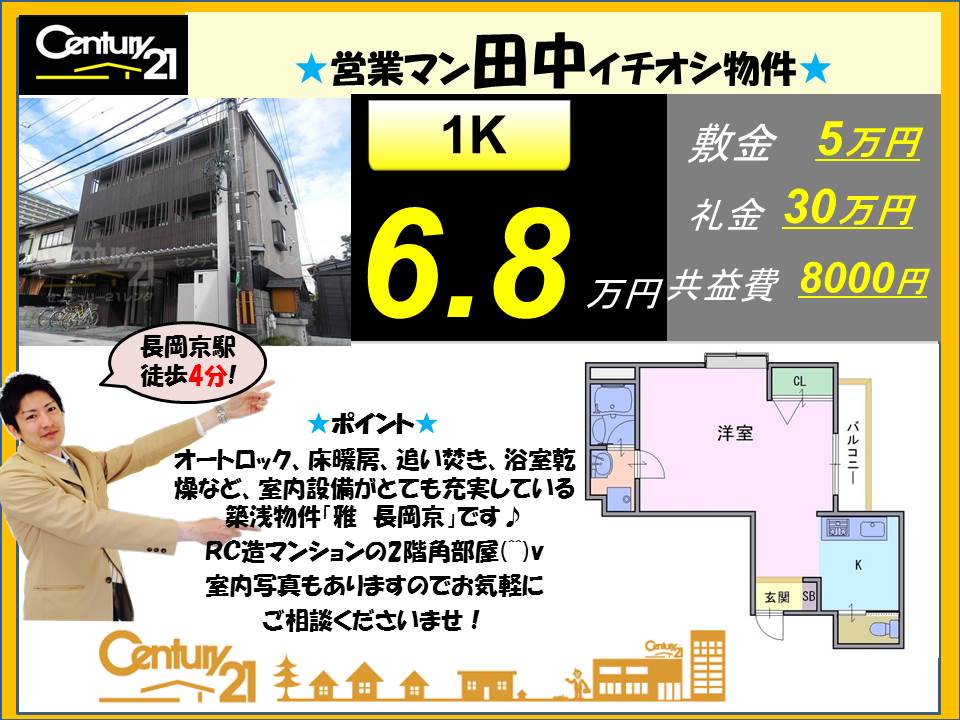 WEBチラシ詳細 2017年10月20日公開 営業 田中のオススメ物件★長岡京市★1K★床暖房・セコム・追い焚きなど設備充実★インターネット無料★ クリックすると、大きな画像でご覧いただけます。 このチラシの関連物件一覧