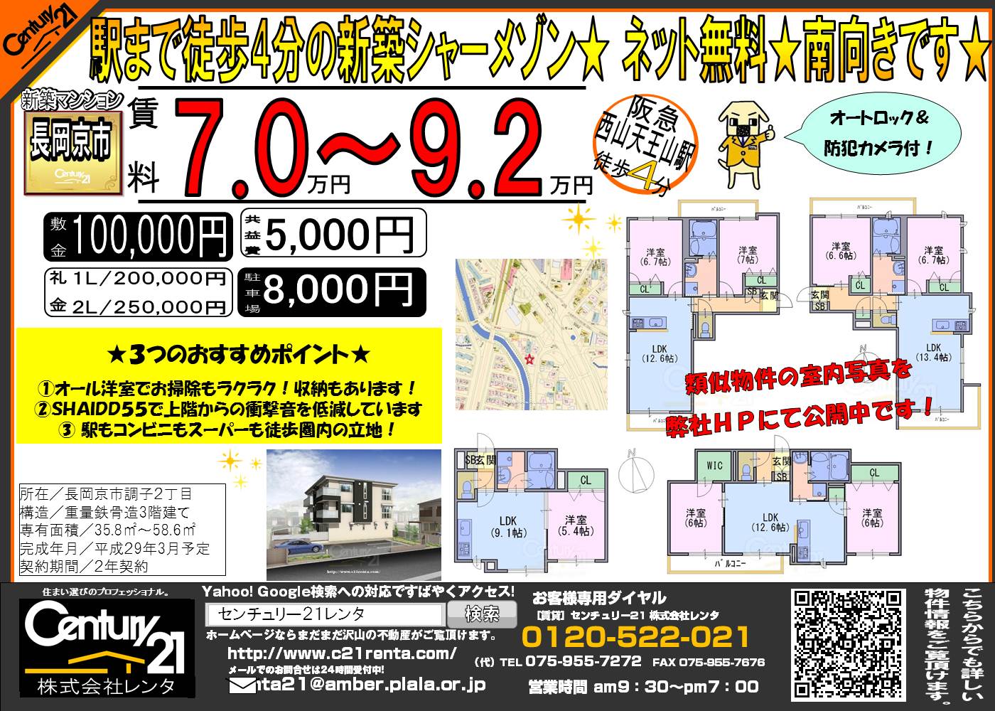 WEBチラシ詳細 2018年01月25日公開 ★長岡京市調子に新築2LDK・1LDK建築中★ 駅まで徒歩4分の新築シャーメゾン★ ネット無料!南向きです★ クリックすると、大きな画像でご覧いただけます。 このチラシの関連物件一覧