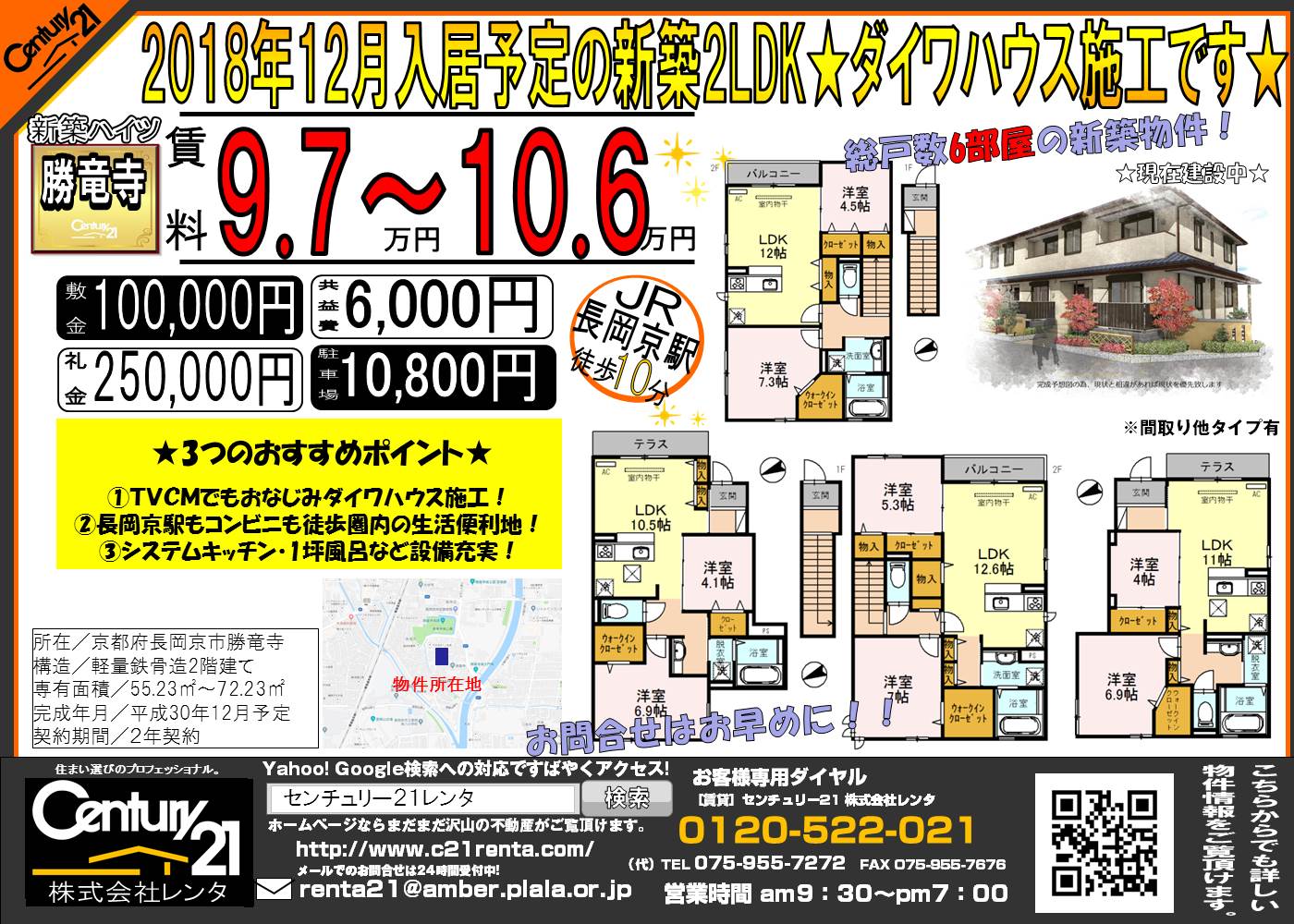 WEBチラシ詳細 2018年10月12日公開 2018年12月入居予定の新築2LDK★ダイワハウス施工です★ 京都府長岡京市勝竜寺 仮称 勝竜寺D-room クリックすると、大きな画像でご覧いただけます。 このチラシの関連物件一覧
