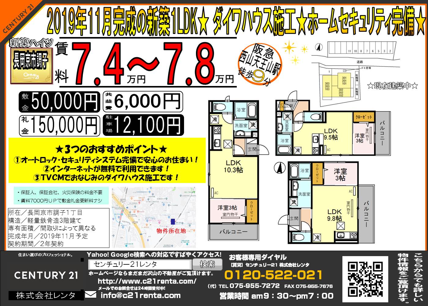 WEBチラシ詳細 2019年09月21日公開 2019年11月完成の新築1LDK★ ダイワハウス施工★ホームセキュリティ完備★ 京都府長岡京市調子1丁目 仮称 調子一丁目Droom クリックすると、大きな画像でご覧いただけます。 このチラシの関連物件一覧