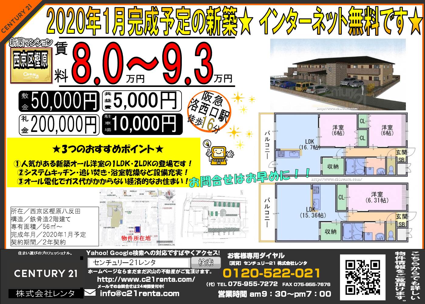 WEBチラシ詳細 2019年11月02日公開 2020年1月完成予定の新築★ インターネット無料です★ 京都府京都市西京区樫原八反田 仮称 樫原八反田共同住宅 クリックすると、大きな画像でご覧いただけます。 このチラシの関連物件一覧