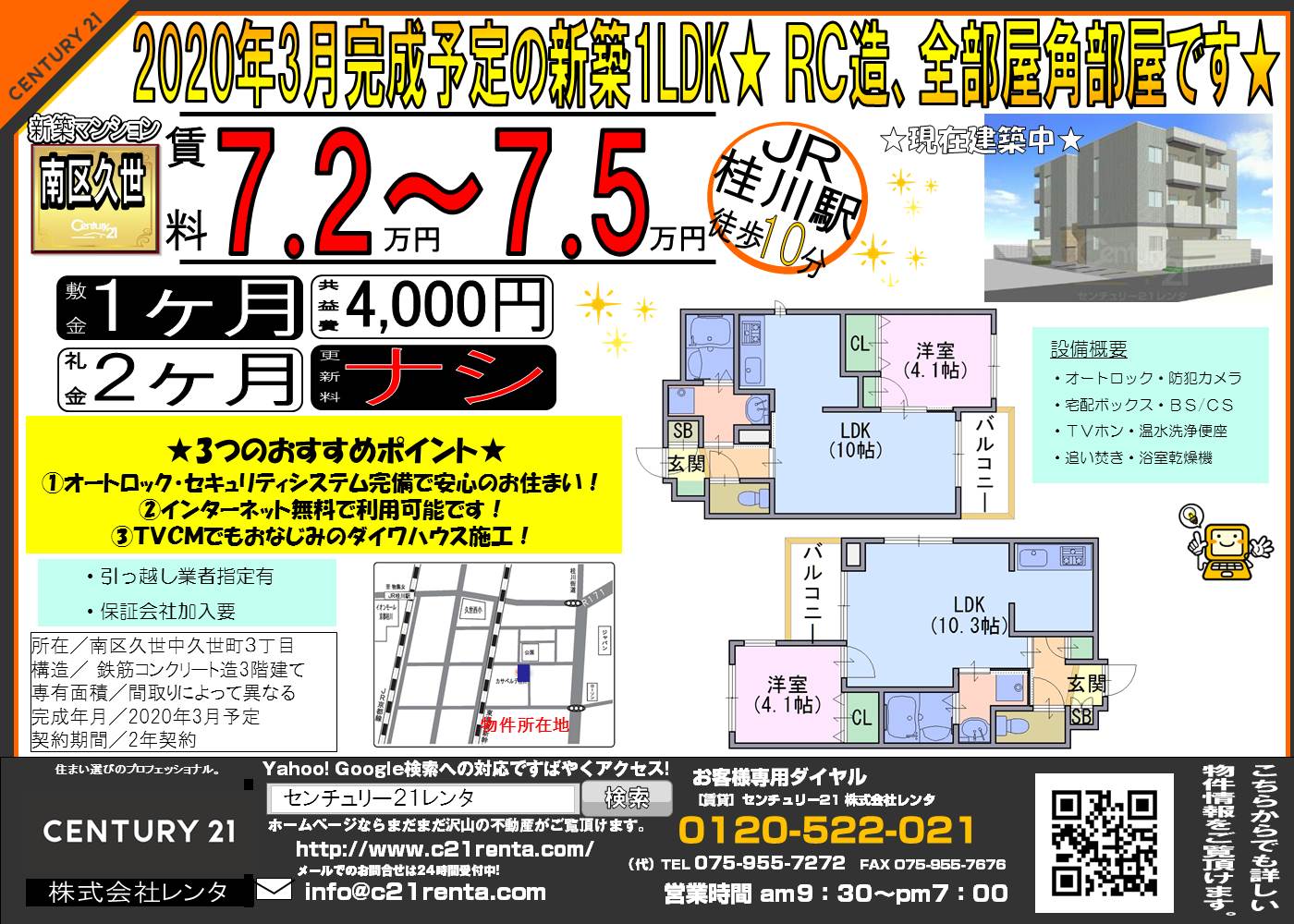 WEBチラシ詳細 2019年12月13日公開 2020年3月完成予定の新築1LDK★RC造、全部屋角部屋です★ 京都府京都市南区久世中久世町3丁目 カサベルデ桂川 クリックすると、大きな画像でご覧いただけます。 このチラシの関連物件一覧