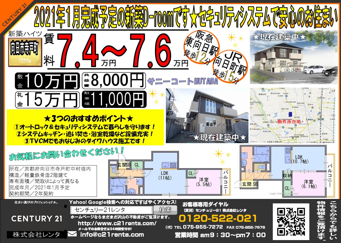 WEBチラシ詳細 2021年01月19日公開 2021年1月完成予定の新築D-roomです★ セキュリティシステムで安心のお住まい★ サニーコートHUTABA 京都府向日市寺戸町中村垣内 クリックすると、大きな画像でご覧いただけます。 このチラシの関連物件一覧