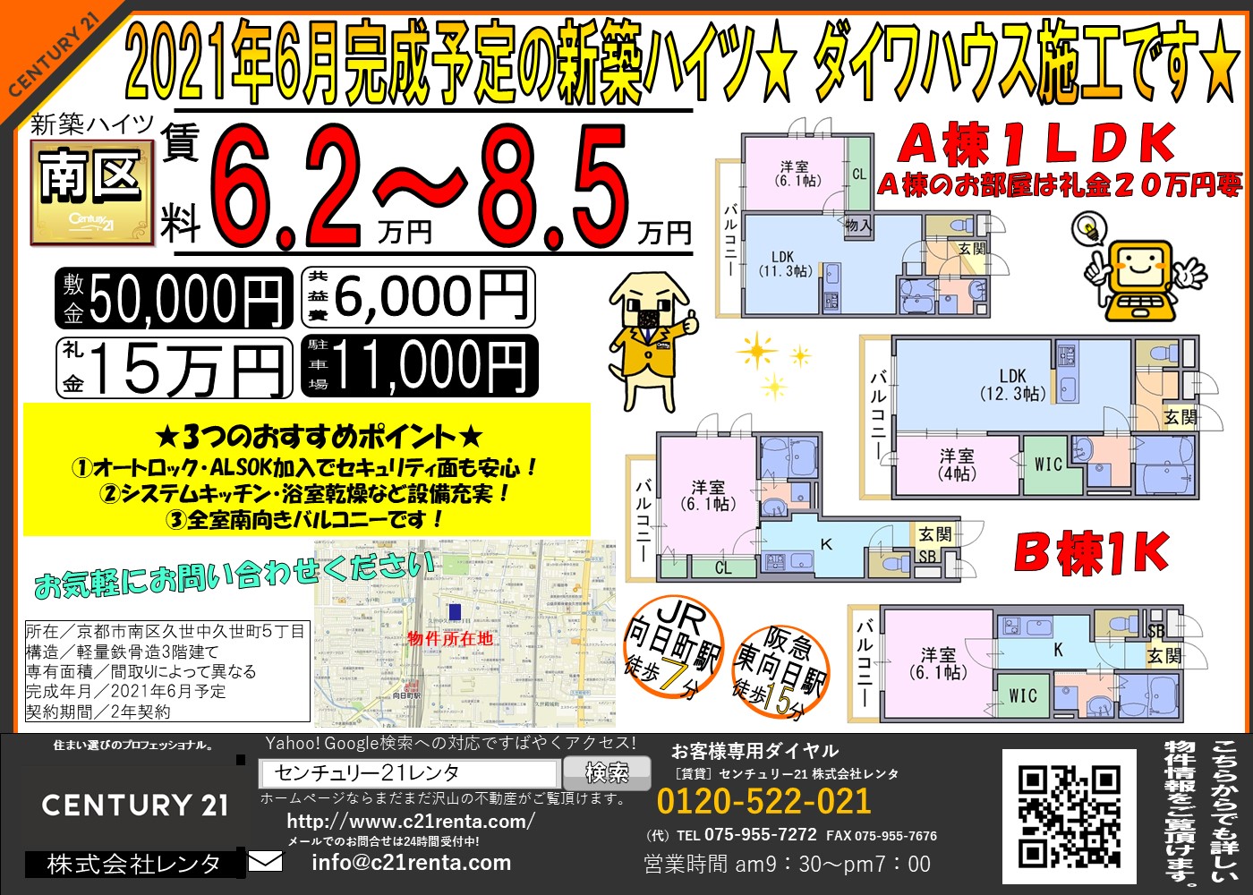 WEBチラシ詳細 2021年03月15日公開 JR向日町駅まで徒歩7分の新築物件★追い炊きや浴室乾燥機など設備充実★ 仮称 南区久世中久世町五丁目 京都府京都市南区久世中久世町5丁目 クリックすると、大きな画像でご覧いただけます。 このチラシの関連物件一覧